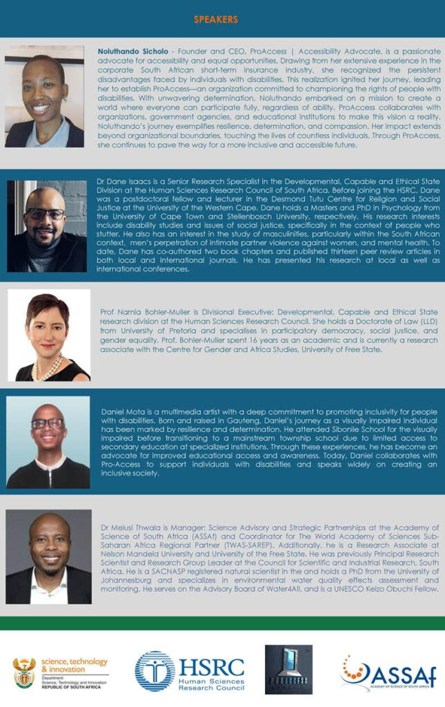 - Opening Remarks: By ProAccess CEO, Ms. Noluthando Sicholo, setting the tone for a robust discussion on accessibility and inclusivity.